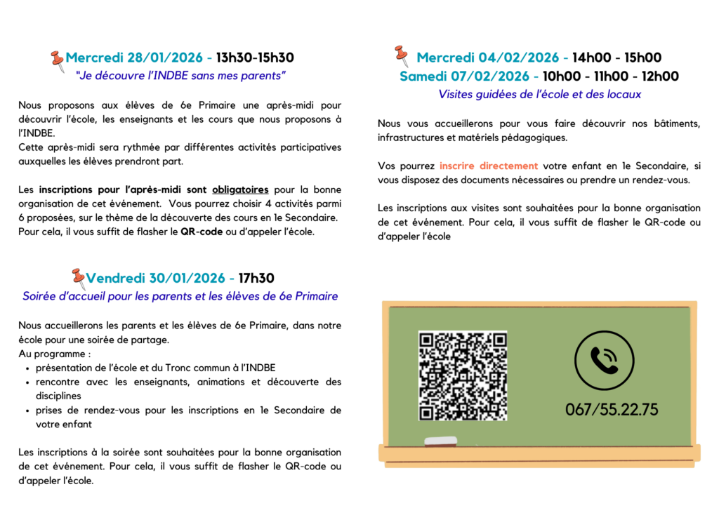 - prendre un rendez-vous avec le secrétariat des élèves, au 067/55.22.75